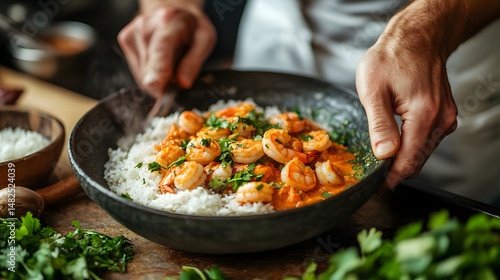 Chef preparing shrimp curry with jasmine rice and fresh herbs on modern counter