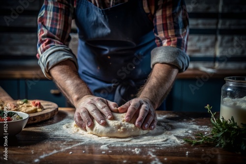 Chef Rolling Dough: Preparing Pastry on a Wooden Kitchen Table
