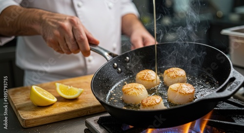 Chef searing scallops in a pan, professional cooking, food preparation. Photo.