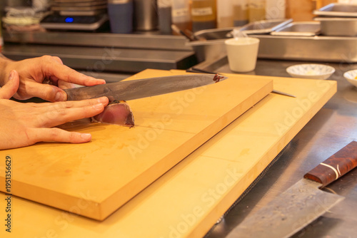 Chef Slicing Seared Tuna with Japanese Knife on Cutting Board in Restaurant Kitchen