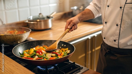 chef, cooking, cook, professional, kitchen, eatery, food, vegetable, stir fry, pan, wok, stove, gas-stove, healthy, health food, meal, dinner, lunch, fresh, prepared, preparing, sizzling, steam, hand, wooden spoon, uniform, apron, culinary, epicure, heat, indoor, horizontal, closeup, food preparation, healthy lifestyle, diet, vegetarian, vegan, delicious, industry, skill, expertise, cookery