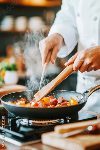 Chef stirring vegetables and sausage in a steaming skillet, capturing vibrant cooking in a professional kitchen..