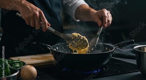 cooking, food, pasta, kitchen, chef, meal, dinner, lunch, cookery, dish, prepare, receipe, taste, delicious, fresh, healthy, ingredient, vegetable, pan, stove, heat, steam, utensil, tongs, scoop, serving, draining, hot, boiling, simmering, gas, burner, flames, blue, dark, background, black, metal, wooden, board, spinach, mushroom, bowl, pot, stainless, steel, process, culinary, gastronomy