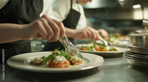chef, kitchen, eatery, food, plating, salmon, tongs, white, plate, table, hand, silver, dish, meal, garnish, cooking, professional, prepare, service, culinary, kitchen utensile, chef, work, clean, presentation, fresh, parsley, dining, appetiser, delicious, freshness, epicure, fine, life events, cookery, preparation, staff