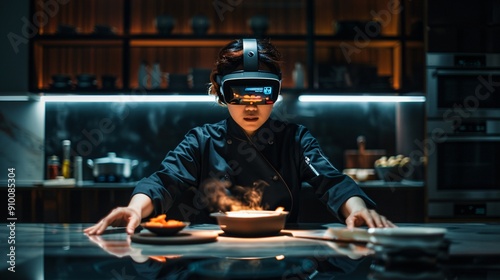 chef, technology, cooking, futuristic, food preparation, culinary arts, innovation, high technology, digital, goggles, professional, eatery, cookery, gastronomic, contemporary, advanced technology