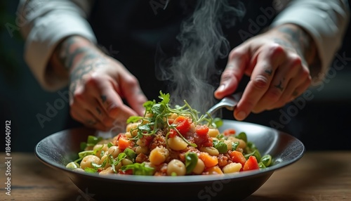 Chef with tattoos plates hot healthy meal of chickpeas, vegetables, and herbs. Steam rises from the dish as he garnishes with greens. Professional cooking in kitchen.