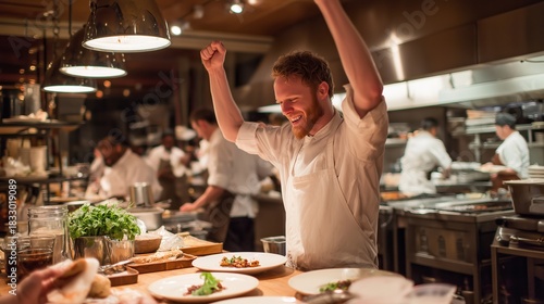 Chefs celebrating success in busy restaurant kitchen after preparing a delicious meal