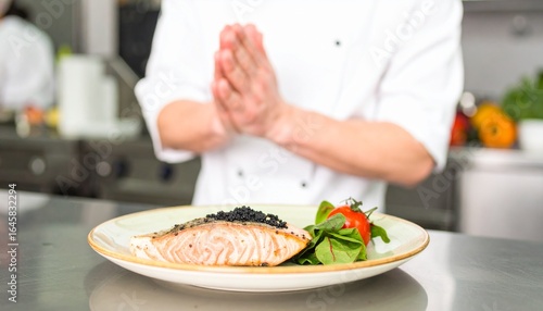 salmon, caviar, food, dish, plate, epicure, chef, hand, cooking, eatery, cookery, meal, delicious, fresh, tomatoes, greener, garnish, culinary, preparation, elegant, fine dining, professional, white, uniform, kitchen, background, sharpened, detail, texture, closeup, healthy, diet, lunch, dinner, seafood, protein, omega, favor, taste, presentation, artistic, creative, skill, expertise, service, quality, style