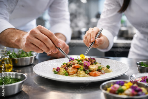 Chefs plating gourmet dish with fresh flowers and seafood delicacies