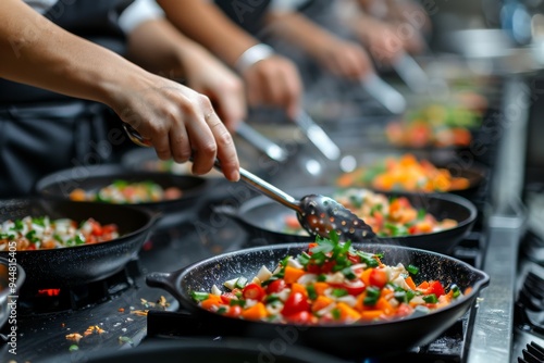 Chefs preparing colorful vegetable dishes in a bustling kitchen during dinner service