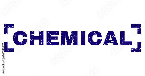 CHEMICAL label seal print with corroded texture. Text caption is placed inside corners. Blue vector rubber print of CHEMICAL with dust texture.
