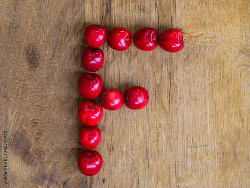 cherry on wooden background as a letter