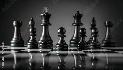 Chess pieces aligned on a checkered board with reflective surface against a dark background, focusing on strategy & planning