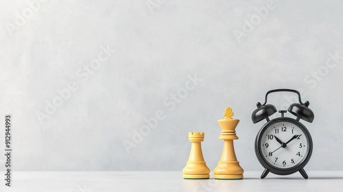 Chess pieces and alarm clock on a gray background. Concept for strategy and time management.
