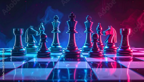 Chess pieces arrayed on a board with neon lighting creating a futuristic, smoky atmosphere around the game pieces