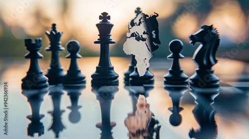 Chess pieces seen from close up, reflecting world map, global market strategy generative ai
