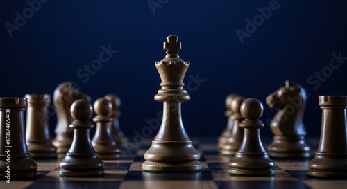 Chessboard Strategem: A close-up shot of a chessboard reveals a strategic array of chess pieces, with the king at the center, poised against a deep blue backdrop.