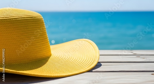 hat, yellow, sunhat, rimmed, leghorn, beach, ocean, sea, water, deck, wood, summer, vacation, travel, relaxation, holiday, fashion, style, accessory, headwear, leisure, coast, horizon, sky, blue, daytime, sunny, get-away, stylish, bright, background, closeup