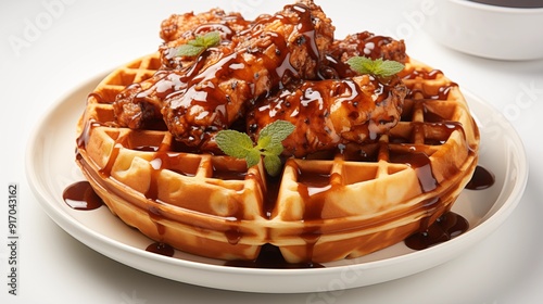Chicken & waffles in close detail, showing off its textures, front view from above, studio lighting, white background.