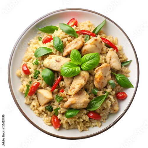 chicken, basil, rice, plate, food, dish, cookery, meal, isolated, white, delicious, aromatic, herb, spicey, asian, thai, cooked, lunch, dinner, savoury, protein, flavorful, healthy, homemade, eatery, tasty, epicure, steaming, seasoned, appetising, traditional, fragrant, stir fry, exotic, tempting