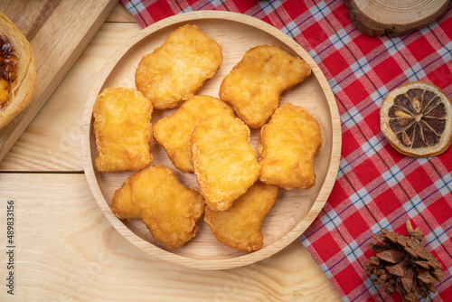 Chicken nuggets in wooden plate on wooden background, Deep fry Chicken nuggets on wooden table.