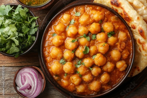 chickpea, curry, bread, side, dish, onion, red, cilantro, green, bowl, brown, wooden, table, background, food, indian, cookery, delicious, flavorful, spice, aromatic, creamy, sauce, garnish, texture, healthy, tasty, traditional, warm, comfort, meal, dinner, lunch, vegetarian, vegan, eatery, home, cooking, receipe, homemade