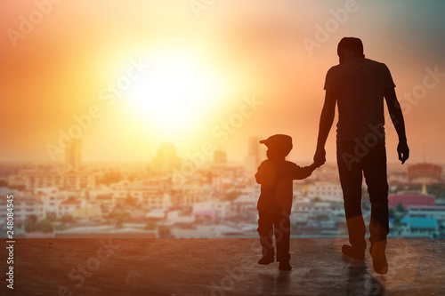 Child, baby holding an adult's hand. Father and son on a walk. Happy lovely baby on a wooden terrace with sun sets blurred. Little baby having fun time activity .silhouette concept.