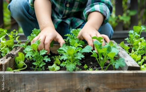 Child nurturing vegetable seedlings with his hands in a raised bed, experiencing the joy of gardening in the fresh air