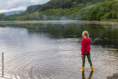 Child playing on a Loch in the Scottish Highlands, on a summers day