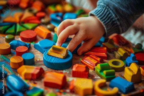 Child playing with colorful wooden shapes on a textured surface. Close-up of hand arranging vibrant geometric blocks. Generative AI