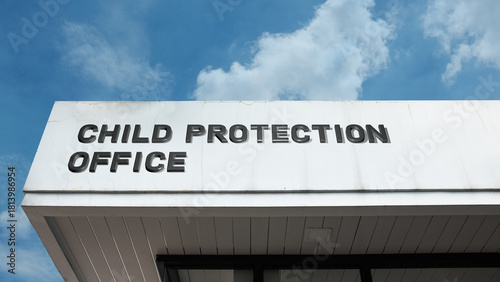 Child Protection Office word sign displayed on a building under a clear blue sky, representing child welfare, social services, safety, advocacy, and government facilities
