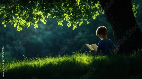 children, reading, book, nature, tree, grass, shaded, quiet, concentration, afternoon, light, peaceful, exploration, imagination, outdoors, relaxation, learning, young, serenity, environment, solitude, greenery, education, hobby, calm, childhood, story, sharpened, creativity, meditative, leisure, calmness, cognition, adventure, curiosity, summer, playful