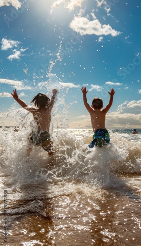 children, beach, wave, splash, fun, sun, joyful, play, jumping, happy, carefree, summer, ocean, children, water, recreation, sea, vacation, sunny, sport, active, horizon, childhood, friends, celebration, energetic, nature, freedom, adventure, enjoyment, togetherness, lively, playful, wet, coastline, holiday, refreshing, family, leisure
