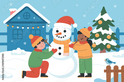 children, winter, snowman, snow, outdoors, playing, fun, happy, cold, children, activity, seasonal, snowfall, fresh, landscape, scene, illustration, holiday, christmas, festive, cheerful, joyful, backyard, friends, family, childhood, weather, cosy, white, frosty, day, vacation, break, december, icy, drawing, cartoon, character, greeting, card, poster, design, playtime, snowflake, building, teamwork, smile
