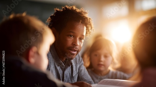 children, teacher, book, learning, group, classroom, education, reading, storytelling, listening, interaction, warm, lighting, sharpened, curiosity, discovery, cognition, development, growth, engagement, communication, imagination, study, teaching, guidance, care, patience, empathy, understanding, diversity, potential, future, hope, happiness, joy, contentment, wonder, enthusiasm