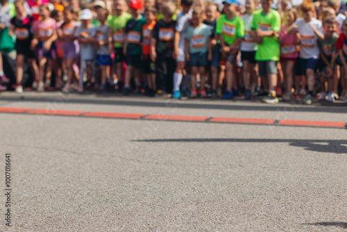 Children marathon runners crowd, young teen sportsmen participants start running in the city streets, crowd of kids joggers in motion, kid group athletes outdoor run, family competition in summer day