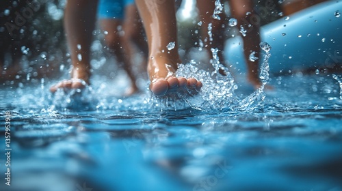 Children's feet splashing in shallow water, playful summer fun