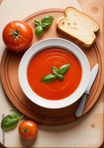 Childrens Illustration Of A Bowl Of Tomato Soup On A Wooden Table With Bread And Basil On A Cutting Board With A Slice Of Bread On The Side.