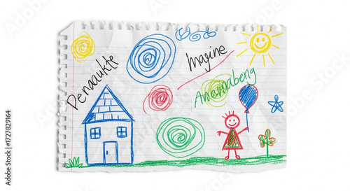 children, drawing, children, art, on, paper, house, girl, balloon, sun, scribble, spiral, colourful, wax crayons, marker, childhood, creativity, imagination, playful, simple, foreigner, naive, hand-drawn, artistic, expression, young, artist, memory, joyful, whimsical, decorative