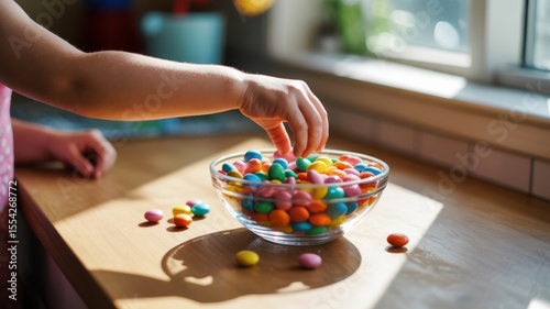 Child's hand reaching for colorful candy in sunlit kitchen
