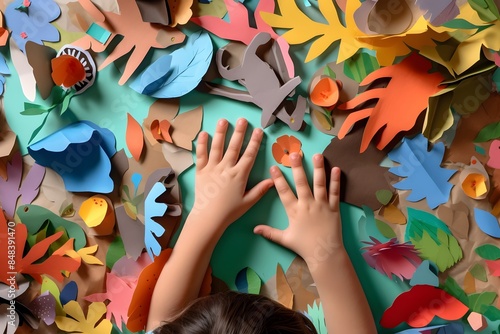 child's hands creating a collage from cutout paper shapes, creativity and learning