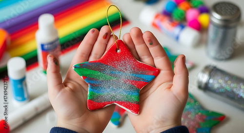 children, hand, holding, star, ornament, craft, art, supply, glistering, paint, glue, colourful, creative, holiday, christmas, decoration, homemade, activity, childhood, learning, development, celebration, festive, hobby, bricolage, project, red, blue, green, yellow, white, sparkly, shiny, bright, closeup, detail, messy, fun, playful, artistic, creation, making, decorating