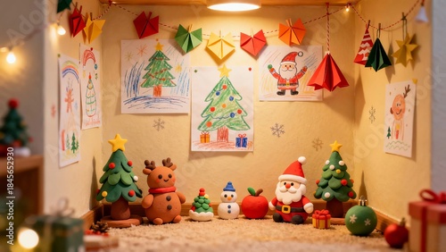 Child's room decorated with Christmas crafts, drawings, and figurines including Santa, reindeer, snowman, and trees.