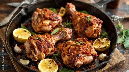 Chili rubbed chicken thighs and drumsticks with crispy golden skin in cast iron skillet with grilled lemon halves, roasted garlic and fresh herbs
