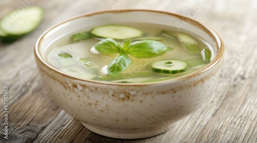 Chilled asparagus and cucumber soup garnished with fresh basil in a rustic porcelain bowl on a wooden surface healthy food concept