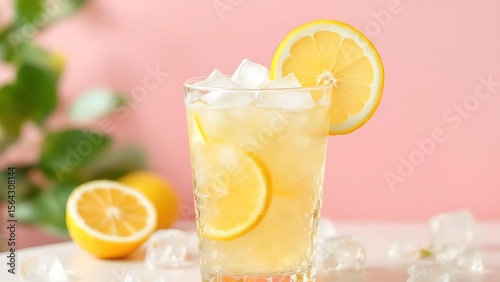 Chilled lemon drink in a textured glass with ice cubes and a lemon slice garnish. Perfect for summer-themed content, beverage ads, or refreshing drink menus