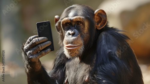 Chimpanzee monkey ape wild animal making a selfie with smartphone, Smart monkey in glasses talks on phone embodies humanlike communication skills,Intimate imagery from within the group of Chimpanzee