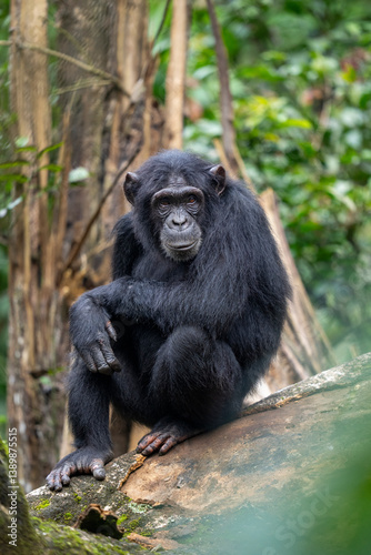 animal, wildlife, vertebrate, mammal, ape, chimpanzee, animal kingdom, mammalia, primate, primate, pan, sitting, resting, rest, endangered, africa, uganda, front view, portrait, rainforest, forest, eye contact, royalty free, looking, endangered species, threatened