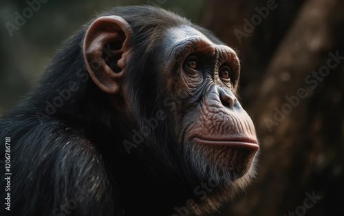 chimpanzee, ape, monkey, primate, animal, wildlife, portrait, closeup, face, fur, eye, hair, black, brown, dark, nature, zoology, mammal, head, expression, looking, gaze, thoughtful, curious, wild, forest, jungle, africa, conservation, endangered, intelligent, mammalian, anthropoid, biology, evolution, natural, close, soft, sharpened, sharp, photo
