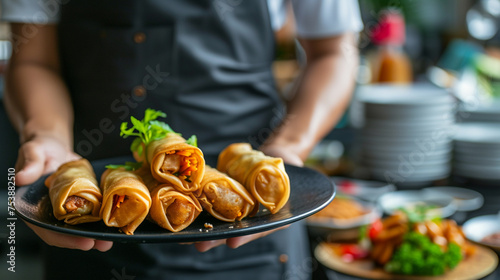 Chinese Cuisine, Spring Rolls, with copy space , Waiter serving in motion on duty in restaurant. The waiter carries dishes